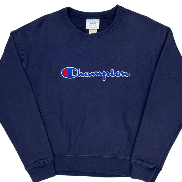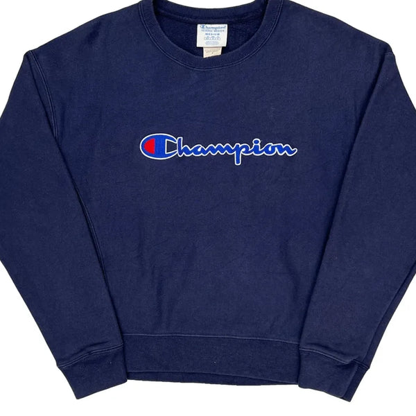 Champion Reverse Weave Navy Sweatshirt With Spellout Logo.