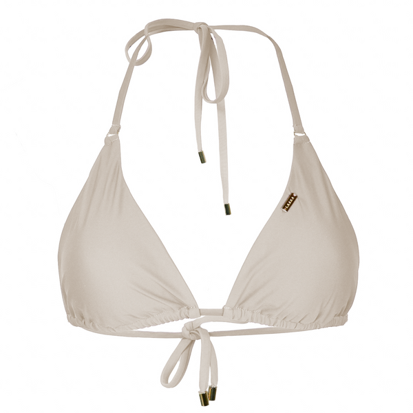 Our Rio triangle bikini Top is a versatile top that will flatter any body type. The gathered triangle comes with removable padding for perfect fit and support and straps tied beautifully around the neck and on the back featuring beautiful golden hardware