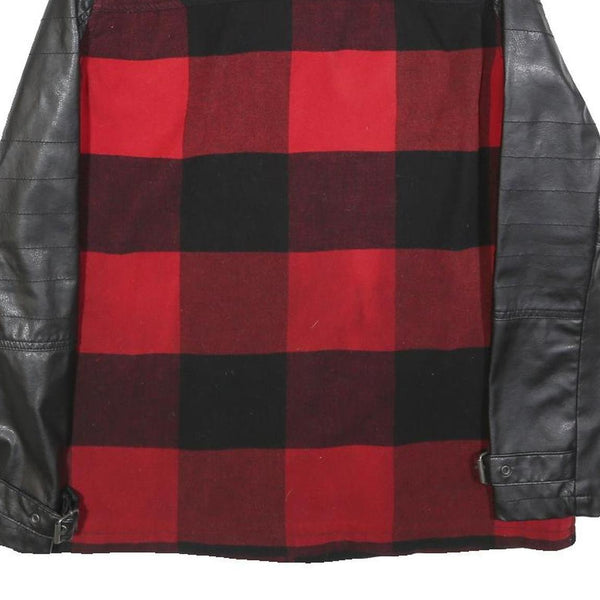 This Womens River Island jacket features a bold red and black checked pattern body with contrasting black faux leather sleeves that add an edgy touch. The front has a button closure and two flap pockets with buttons, creating a classic yet contemporary look. The collar is a standard shirt style that complements the overall design.