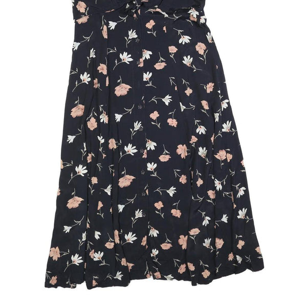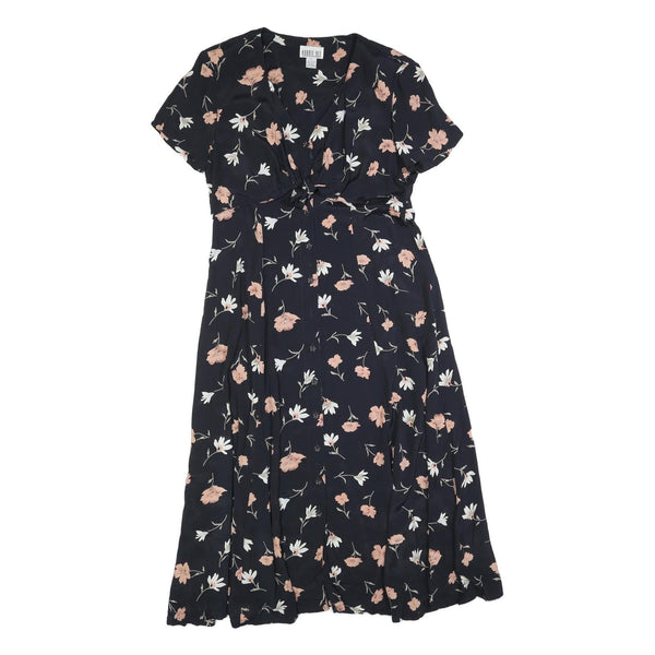 This ROBBIE BEE womens dress features a black base adorned with a delicate floral print in soft pink and white, giving it a very elegant and feminine look. The dress has a flattering V-neckline with a gathered bust detail, short sleeves, and a flowing midi length skirt, perfect for daywear or casual occasions.