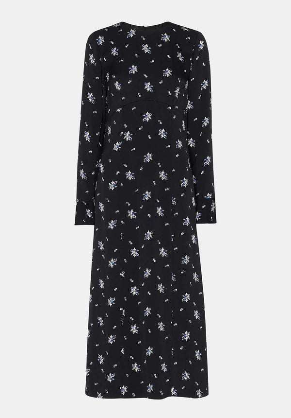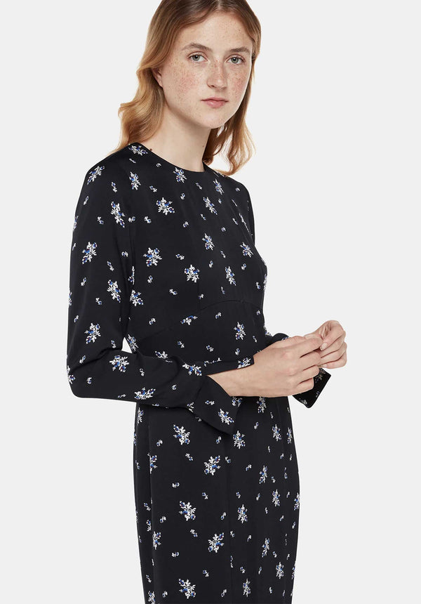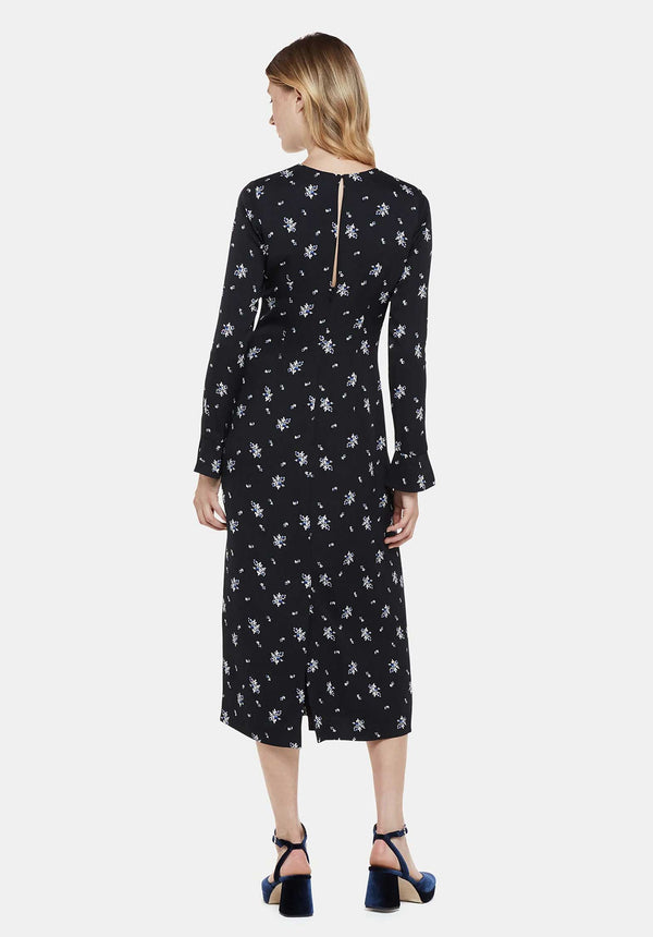 Designed in a classic black with a subtle print, this midi dress comes with fluted cuffs for even more elegance. The material is an elevated satin and it lends itself to evening styling with ease - just add sleek, minimal heels and high-shine jewelry.