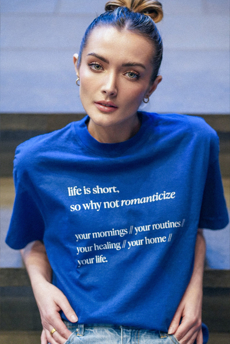 A boxy, loose-fitting, cropped fit the Relaxed Tee dyed in limited-edition Cobalt Blue to match our viral Romanticize Your Life graphic. This shirt has no side seams for a classic, tubular body. Made hyper-efficiently in Los Angeles using 80% less fabric cutting waste, 10% less sewing labor, and less energy consumption overall than our original tees. Claudia wears size small.