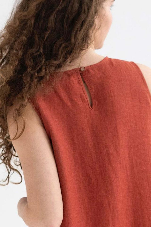 Best-selling Royal Toscana dress in a new colour - clay. The breathable and sleeveless linen dress designed to have a relaxed, loose fit and features an asymmetrical high-low hem, two side pockets, and a coconut button closure on the back.