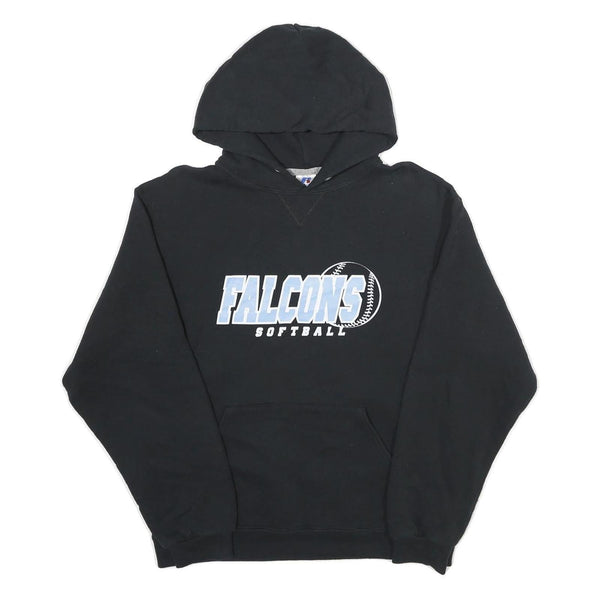 This black Russell Athletic hoodie features a bold graphic on the chest with the word "FALCONS" in light blue and white lettering, accompanied by a soft ball design, highlighting a sports team theme. The hoodie is constructed from a comfortable cotton blend material, providing warmth and softness against the skin. It is designed as a pullover style with a spacious hood and a front kangaroo pocket, adding both functionality and casual style.