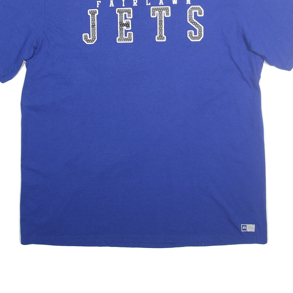 This Russell Athletic Mens T-shirt features a rich blue colour with bold white lettering across the chest spelling "FAIRLAWN JETS" in a collegiate style print. The shirt has a classic crew neck and short sleeves for a versatile, casual look.