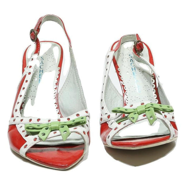 These SACHELLE womens high heels feature a striking red leather body accented with white leather trim embellished with small circular cut-outs. The front is decorated with a unique green buckle detail adding a playful contrast to the design. The heels are slingback style with an adjustable buckle strap for a secure fit.