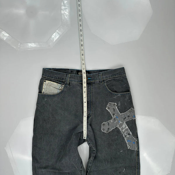 Sacred Ground Raw Blue Jeans, fit a 34″ Waist and 30″ inseam.