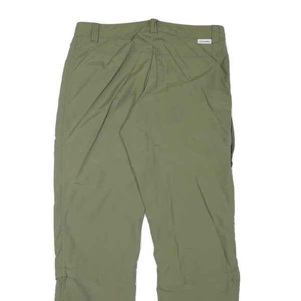 These womens Schöffel trousers feature a muted olive green colour with a subtle embroidered brand logo on the front left thigh. Crafted from a comfortable polyester blend fabric, they offer lightweight, durable wear ideal for outdoor activities or casual use.