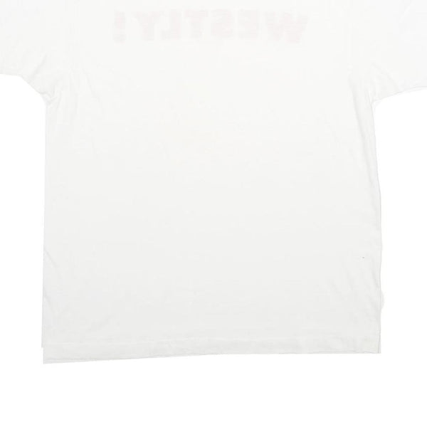 This Mens SCREEN STARS T-Shirt features a clean white base with bold red text "WESTLY!" prominently printed across the chest. The shirt has a classic crew neckline and short sleeves, offering a timeless casual style with a graphic statement. Made from a comfortable cotton blend fabric, it provides a soft and breathable feel suitable for everyday wear.