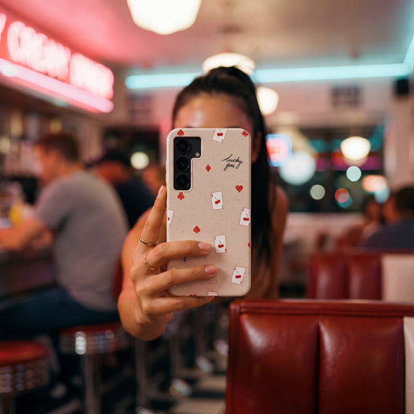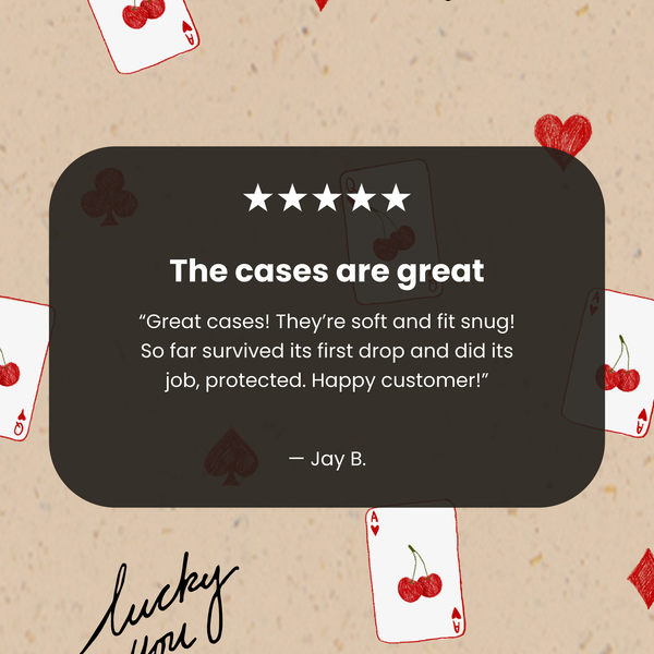 Feeling lucky? The Lucky You Phone Case is here to bring a little extra charm to your day! Featuring cute cherry-adorned playing cards, hearts, clubs, and the handwritten “lucky you” scattered across a natural background, this case is perfect for anyone who loves a playful touch of fortune. ♠️♥️