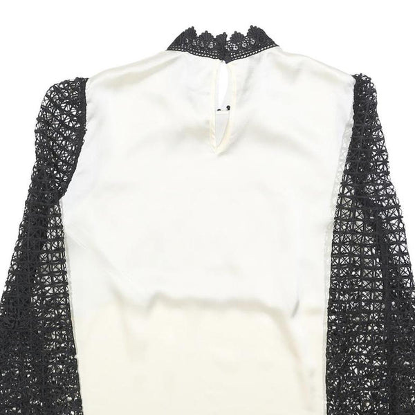 This SELF-PORTRAIT womens blouse features a striking combination of black lace overlay and white fabric, creating a refined and elegant look. The front showcases intricate lace detailing in black floral and geometric patterns, complemented by full-length sheer lace sleeves with puffed volume and fitted cuffs, adding texture and sophistication.