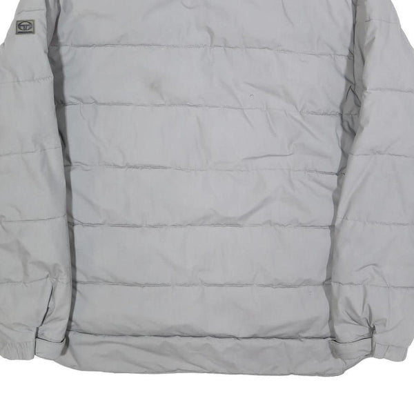 This Sergio Tacchini Mens jacket features a clean grey colour with a subtle horizontal quilted design. It has a stand-up collar and is fastened at the front with a zipper. The jacket shows the brand's simple logo patch on the sleeve and has two side zippered pockets for convenience. The fabric presents a smooth, polyester blend material that offers a lightweight but warm outer layer, suitable for transitional weather.