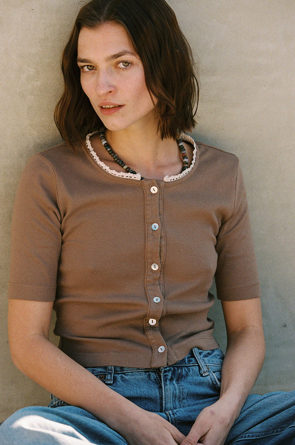 Inspired by nostalgia. Our button front short sleeve cardi features a slight crop length, lace trim and delicate shell buttons. Made of organic baby rib fabric.