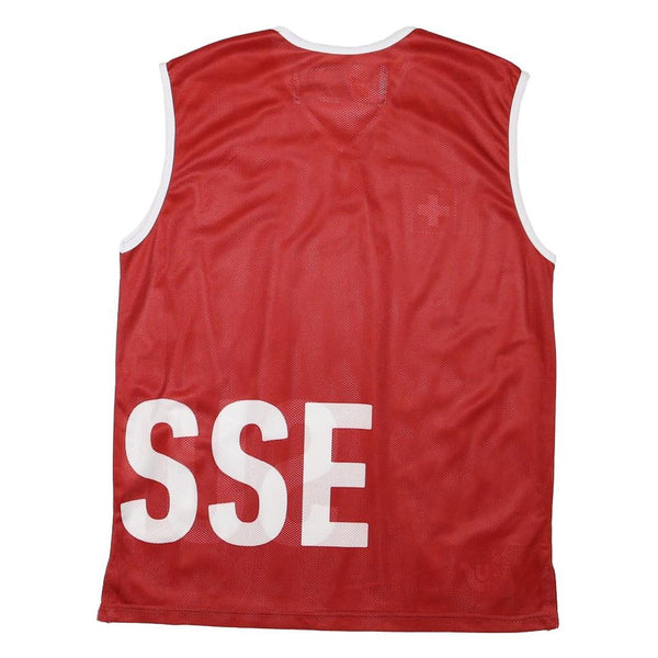 This sporty SHSV FSSU mens T-shirt features a vivid red colour with contrasting white trims along the sleeveless armholes and V-neckline. Bold white printed text 'SUI' decorates the front lower side, while the back shows the continuation of the text 'SSE', creating a striking graphic effect. The chest also includes a small white plus symbol within a square box for added branding detail.
