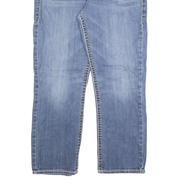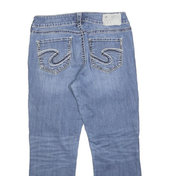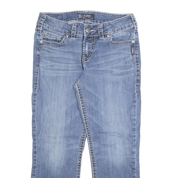 These SILVER womens jeans are presented in a classic blue denim with a light wash. They feature a slim fit silhouette that tapers to the ankle, offering a modern and flattering look. The jeans have a traditional five-pocket design with distinctive stitch detailing on the back pockets and a zip closure at the front.