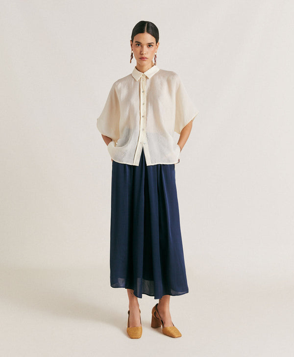 Acetate and silk crepe skirt with elasticated back waistband. High waist, midi length. Deep front pleat and delicate gathers around the waist give Nicolas sinuous movement.