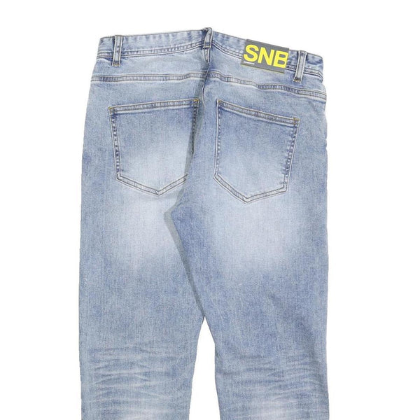 These blue SONNY BONO womens jeans feature a light denim wash with subtle distressing and fading on the front thighs and knees, creating a stylish, lived-in look. The jeans include a classic five-pocket design and a branded SNB patch on the back waistband.