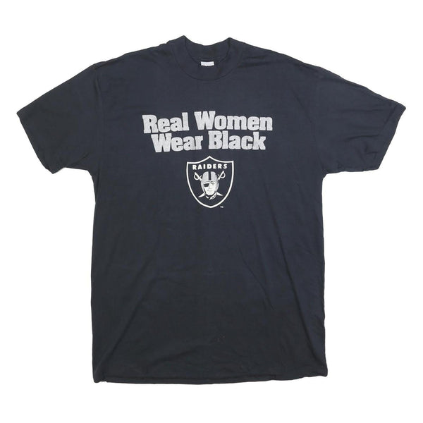 This men's T-shirt features a black base colour with a bold white graphic text across the chest stating "Real Women Wear Black". Below the slogan is the iconic Raiders logo, consisting of a shield with a helmeted figure and crossed swords, printed in white for strong contrast. The back of the T-shirt is plain black with no additional markings.