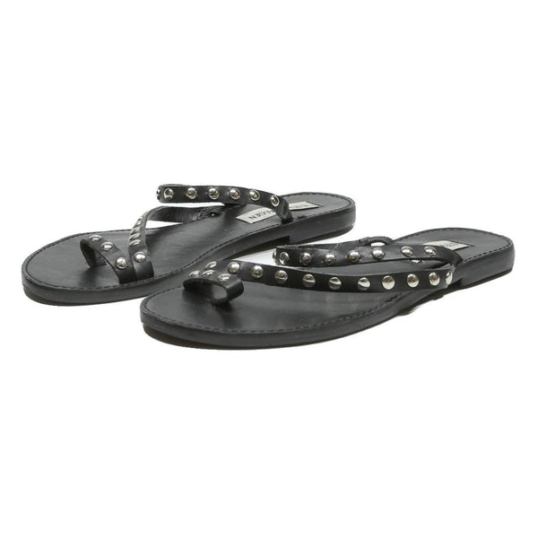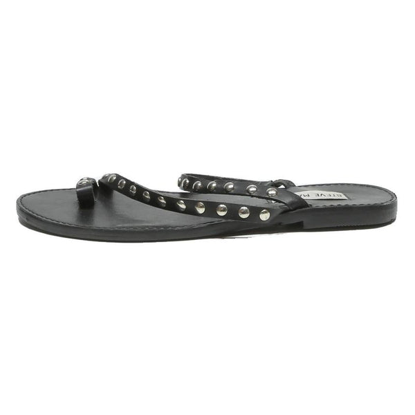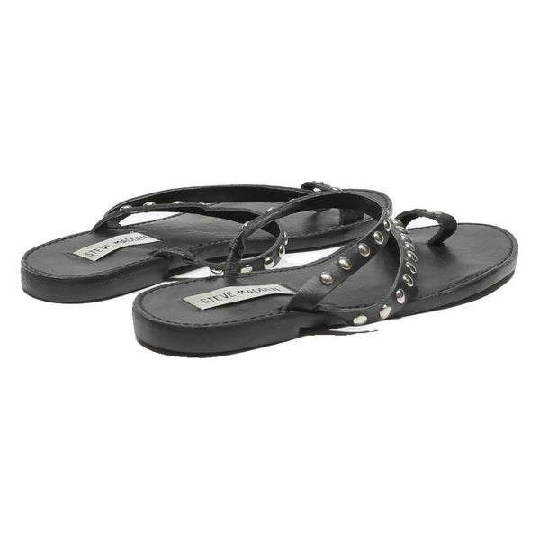 These Steve Madden womens sandals feature sleek black leather straps decorated with silver studs, offering a modern and edgy look. The design includes a toe loop for secure fit and a minimalist flat sole for comfortable casual wear.