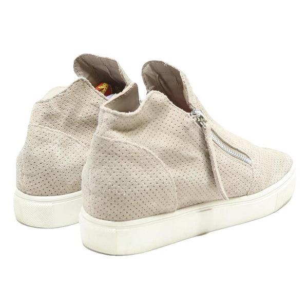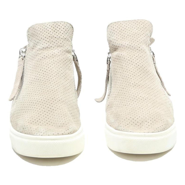 These Steve Madden ankle boots for women are crafted from soft beige leather with a perforated finish, providing a stylish and breathable design. The shoes feature a practical side zip for easy on and off, complemented by a sleek white rubber sole that offers modern contrast and casual appeal.