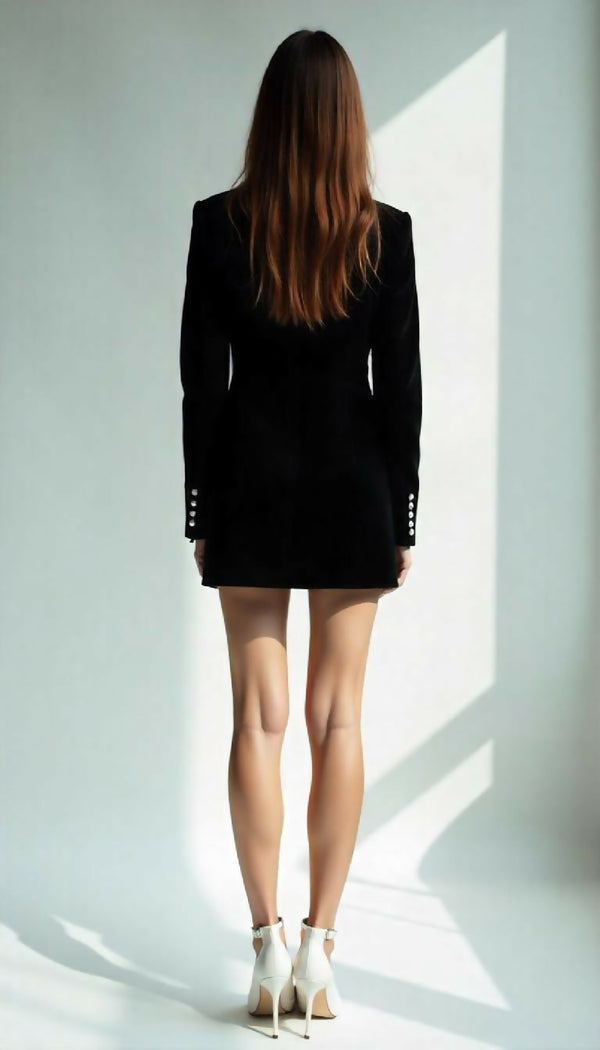 Bold, sophisticated, and undeniably glamorous, the Noir Velvet Midnight Blazer Dress is a statement of timeless elegance. Crafted from luxurious viscose velvet, this mini-length dress blends power dressing with a touch of old-world charm. The structured silhouette, sharp lapels, and front button closure create a polished yet sultry appeal, while the full sleeves add a refined touch. Perfect for evening soirées, cocktail nights, or when you simply want to command attention with confidence.