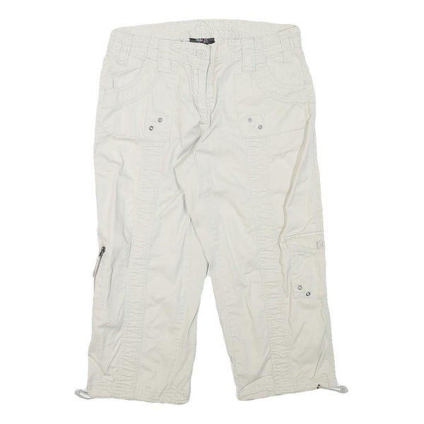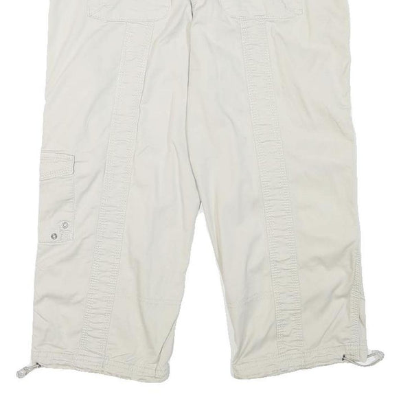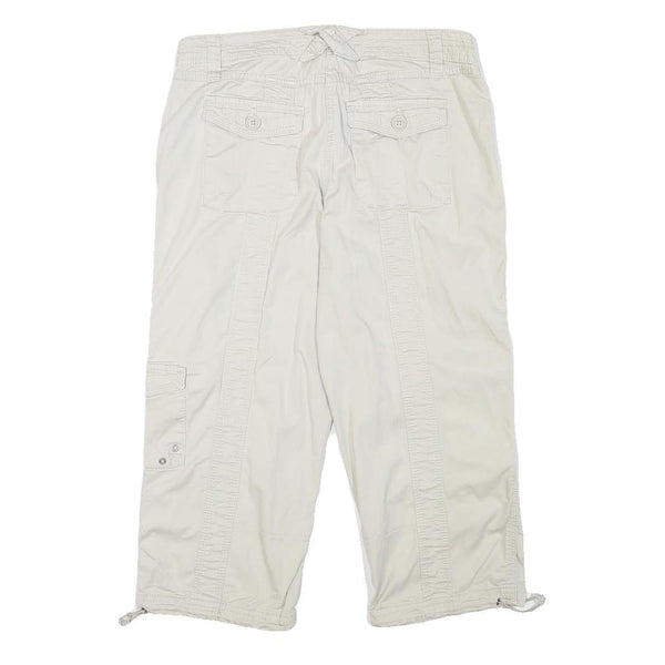 These Style And Co womens shorts come in a clean white colour with a plain pattern. They feature multiple cargo-style pockets with button and zip details, adding functionality and style. The shorts have elasticated panels and drawstring adjustments at the hem for a comfortable and adjustable fit.