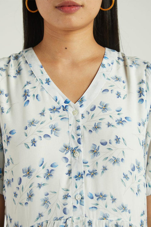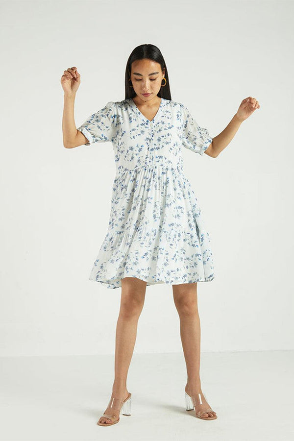 A short, flared dress made with a bright, pretty print; the puff sleeves add a little volume to the bodice of this gathered, tiered dress. A great choice for your next summer escape!