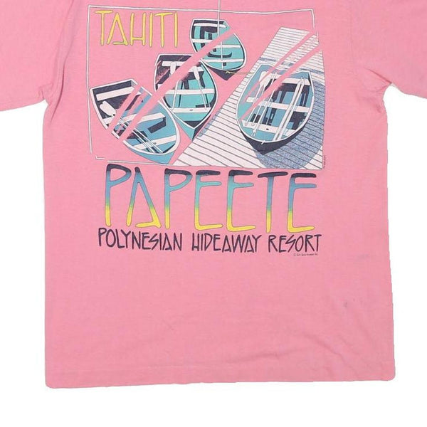 The back showcases a large graphic print depicting colourful boats with the text "TAHITI" and "PAPEETE POLYNESIAN HIDEAWAY RESORT" in a playful, artistic style. The t-shirt has short sleeves and a crew neckline, making it perfect for casual summer wear or resort outings.