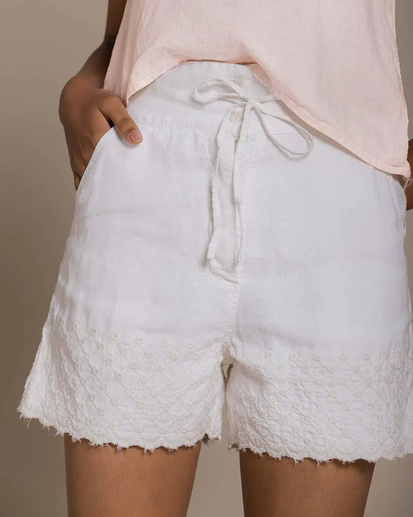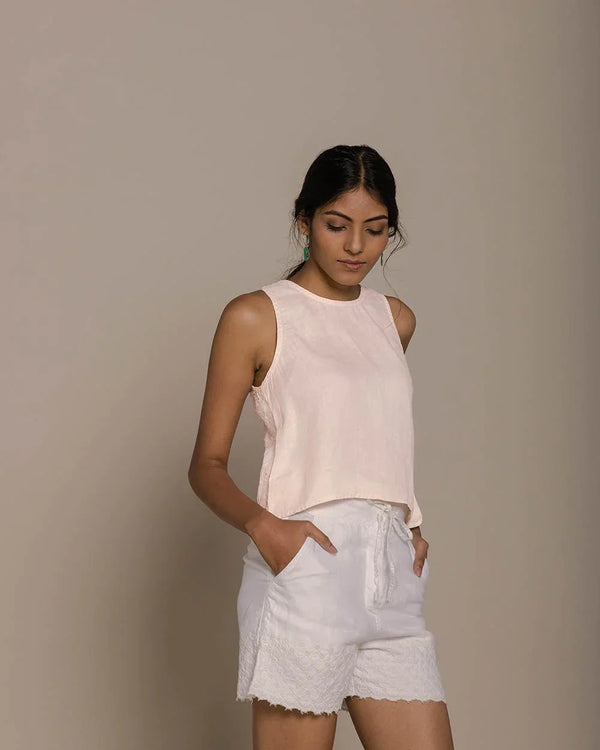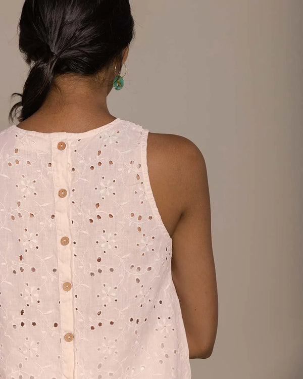 This sleeveless top surprises with an eyelet embroidered back with coconut shell buttons for a fun flare.