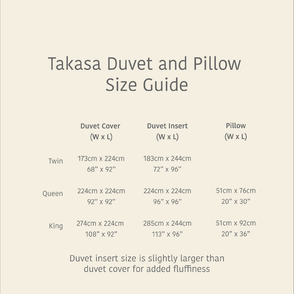 - Duvet insert size is slightly larger than duvet cover for added fluffiness