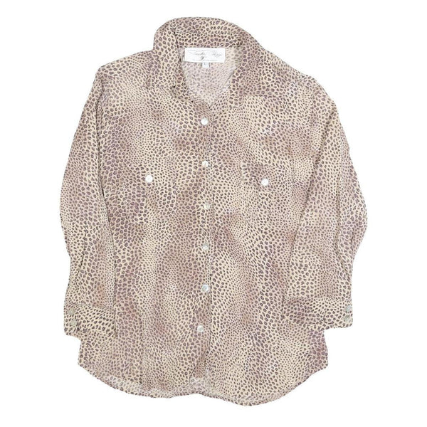 This womens shirt by TASHA POLZZI features a soft beige base with a subtle brown animal-inspired print throughout. It has a classic shirt design with long sleeves and a button-up front, accented by a button neck collar for a polished look. The fabric is lightweight and smooth, crafted from soft rayon that drapes comfortably.