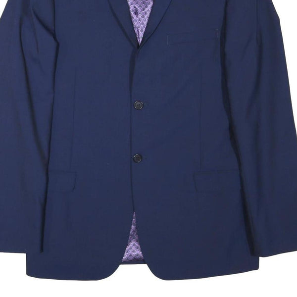 This Ted Baker mens jacket is a deep blue colour, featuring a classic tailored design with a two-button front closure and notch lapel collar. It has a smooth appearance with a plain pattern on the outer fabric, while the interior lining displays a subtle patterned design in purple tones, adding a touch of distinction and luxury. The jacket includes flap pockets at the sides and a chest welt pocket, ideal for a polished, smart look.