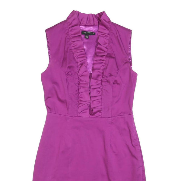 This TED BAKER womens dress features a vibrant purple colour with a luxurious satin sheen. The sleeveless design is complemented by a striking ruffled V-neckline for a classic, elegant style. The dress fits close to the body with darting for shape and extends to a midi length, perfect for day or smart casual occasions.