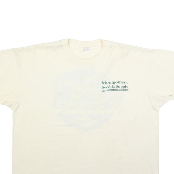 This womens T-shirt by Teejays features a soft cream base colour with distinctive green printed graphics. The front displays a small text logo 'Montgomery Seed & Supply' while the back boasts a large circular design stating 'The Connoisseurs of Manures Since 1904'. The fabric is made of comfortable cotton, offering a breathable and wearable feel ideal for casual use.