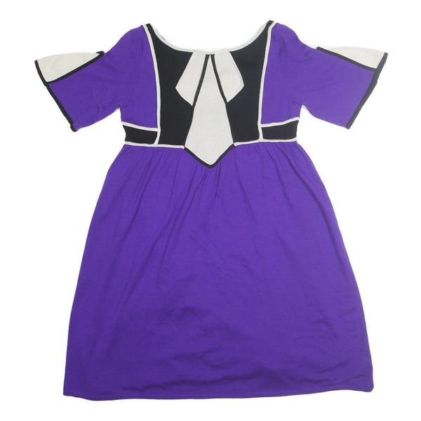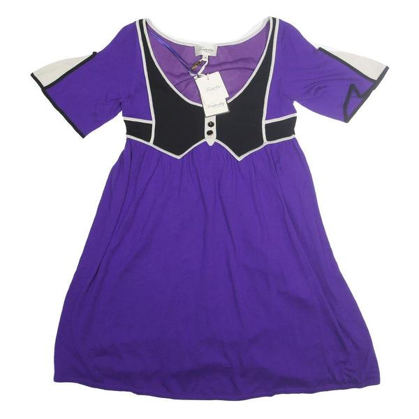 This Temperley London womens dress features a vibrant purple base with black and cream panel detailing on the bodice and sleeves, creating a striking colour-block effect. The dress showcases a V-neckline with two decorative buttons and contrasting edging for added definition. The slightly flared design falls above the knee, offering a comfortable, easy fit with elbow-length sleeves.