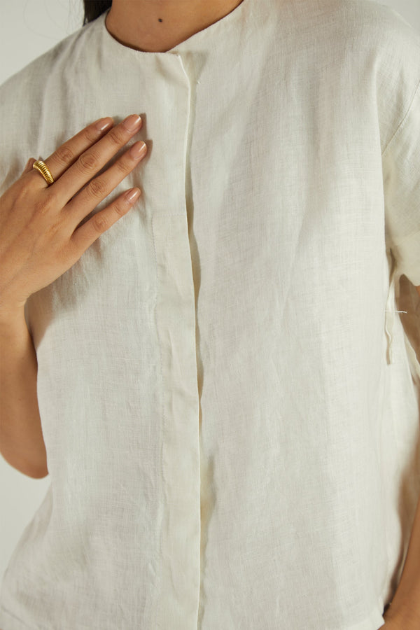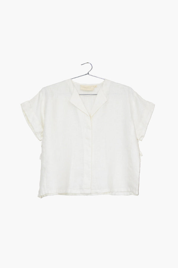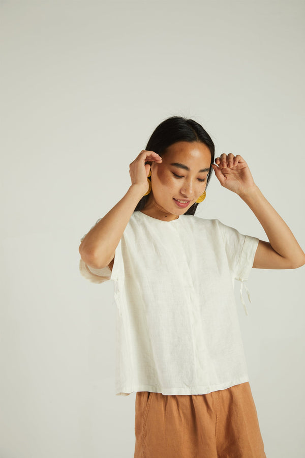 A boxy shirt with cap sleeves that tie up at the bottom, this hemp separate is a great addition to your everyday wardrobe.