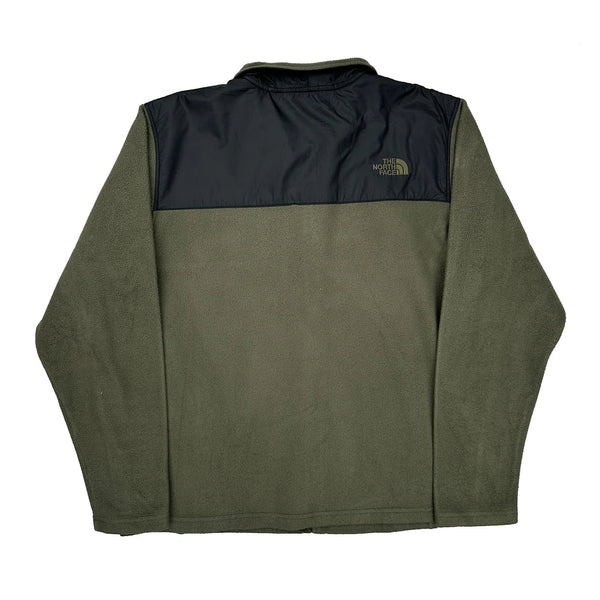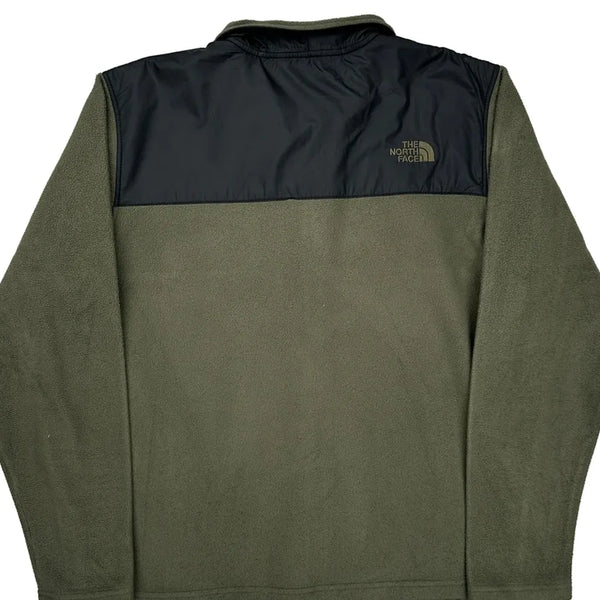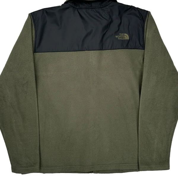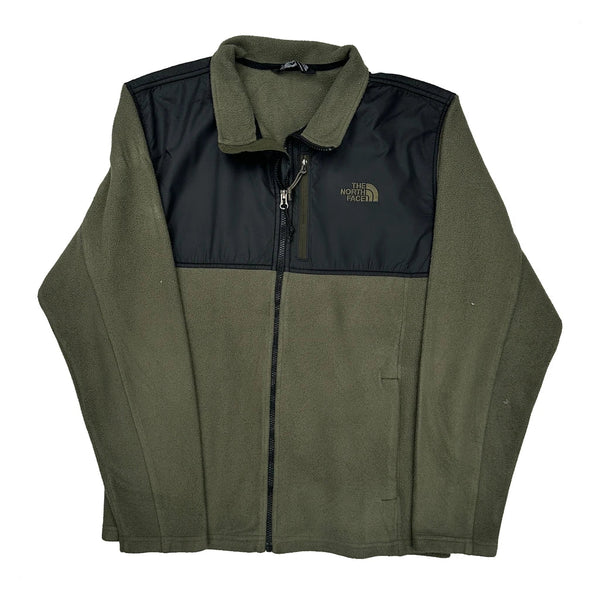Olive Green Fleece Jacket With Black Shoulder Panels.