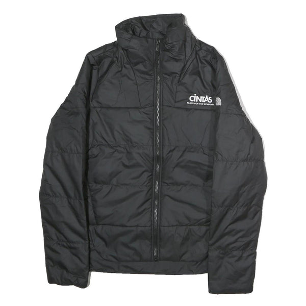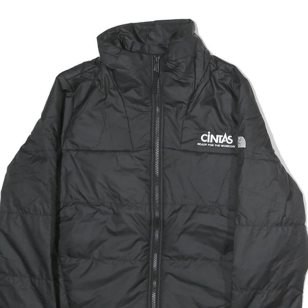 This mens black jacket from The North Face features a sleek puffer design with horizontal quilting for added warmth and style. The front sports a zipped closure and a branded Cintas logo alongside The North Face emblem, providing unique collaboration branding. On the back and sleeve, additional The North Face logos are visible, emphasizing the premium outdoor heritage.