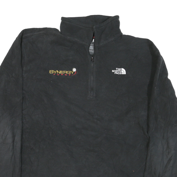 This mens pullover jumper from THE NORTH FACE comes in a solid black colour with embroidered logos on the front chest, including a white brand emblem and a yellow and red 'SYNERGY FORCE' detail. The half zip design features a high neck for added warmth and comfort. Crafted from a polyester blend, it offers a soft and cosy feel, making it ideal for chilly days.