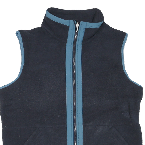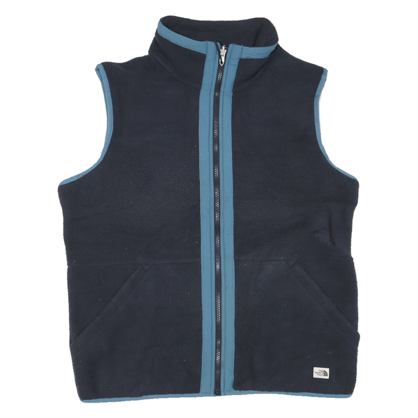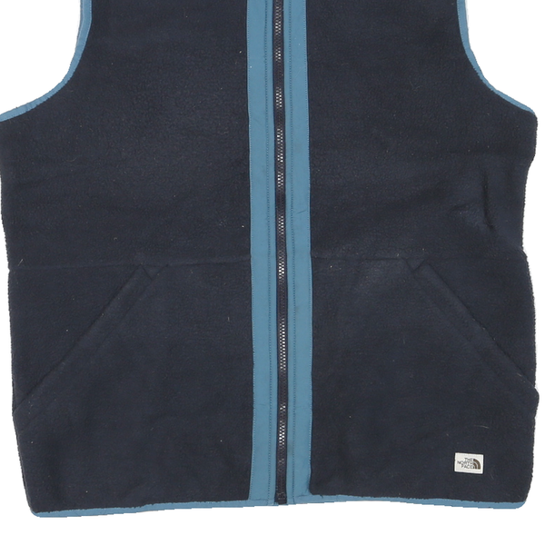 This men's fleece jacket from THE NORTH FACE features a deep blue base with light blue trim along the zip fastening, armholes and collar. It has a clean, minimal style with a small THE NORTH FACE logo patch on the front pocket. The sides are sleeveless, making it an ideal layering piece.