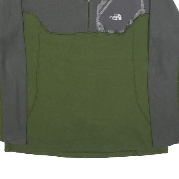 This men's jumper by THE NORTH FACE showcases a two-tone design with olive green and slate grey polyester fabric. It features a half-zip front neckline with a stand-up collar, adding versatile ventilation options and a sporty aesthetic. The chest area includes a distinctive grey patch with the THE NORTH FACE logo in white.