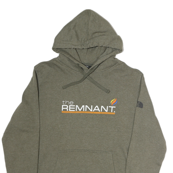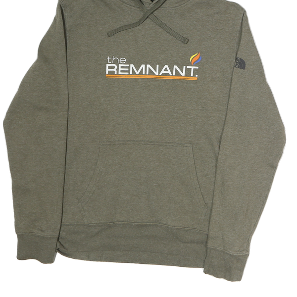 This mens hoodie by The North Face features a muted green colour with a prominent front print reading "the REMNANT." underlined in orange with a flame motif. The left sleeve also showcases the branded logo in black, enhancing its authentic outdoor appeal. Made from soft cotton, the fabric feels comfortable and breathable, perfect for layering in cooler weather.