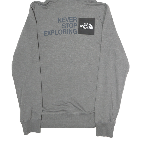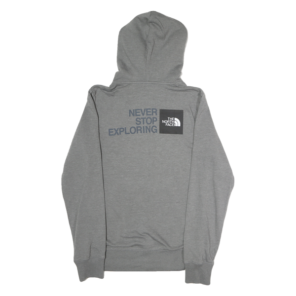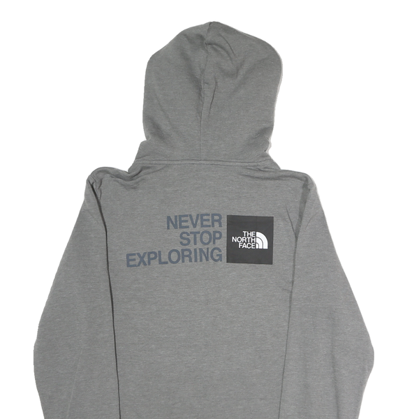 This men's hoodie from THE NORTH FACE comes in a versatile grey colour with a clean and minimalistic look. The front features a small black logo on the chest, while the back displays the motivational text "NEVER STOP EXPLORING" alongside a larger version of the brand's iconic logo.