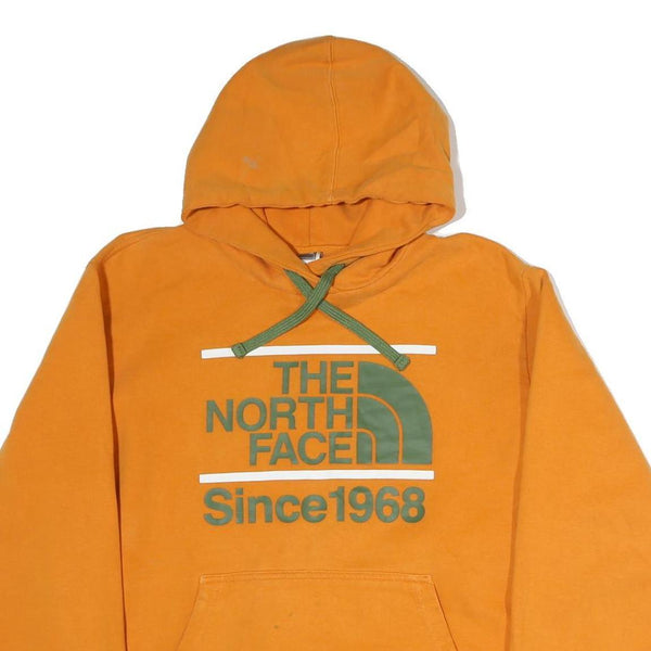 This men's hoodie from THE NORTH FACE features a bold orange colour with a prominent front print displaying the brand name and 'Since 1968' in green and white accents. The hoodie includes contrasting green drawstrings for the hood and a large kangaroo pocket for convenience.