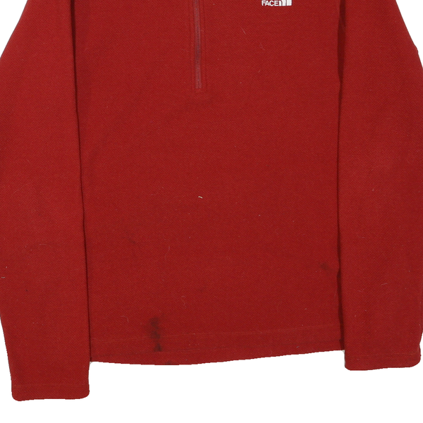 This mens jacket from THE NORTH FACE is crafted in a warm red polyester blend fabric. It features a half-zip front closure and a stand-up collar for added protection against the cold. The white embroidered THE NORTH FACE logo is visible on the left chest, providing subtle and iconic branding.