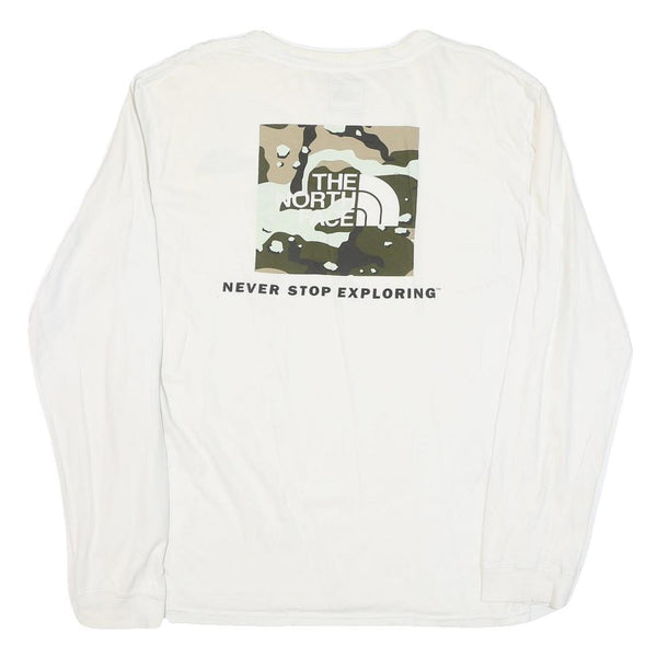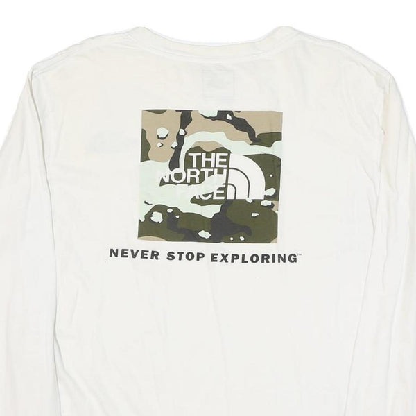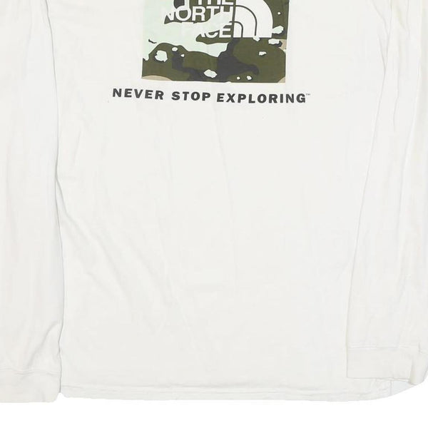 This men's long sleeve T-shirt from The North Face features a clean white base with a small black logo on the front left chest. On the back, a larger square graphic showcases the brand's logo with a camo pattern background and the iconic slogan "Never Stop Exploring" printed underneath.