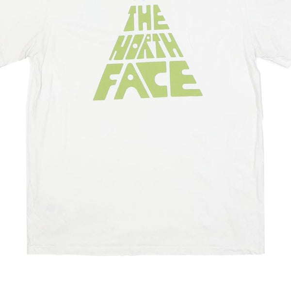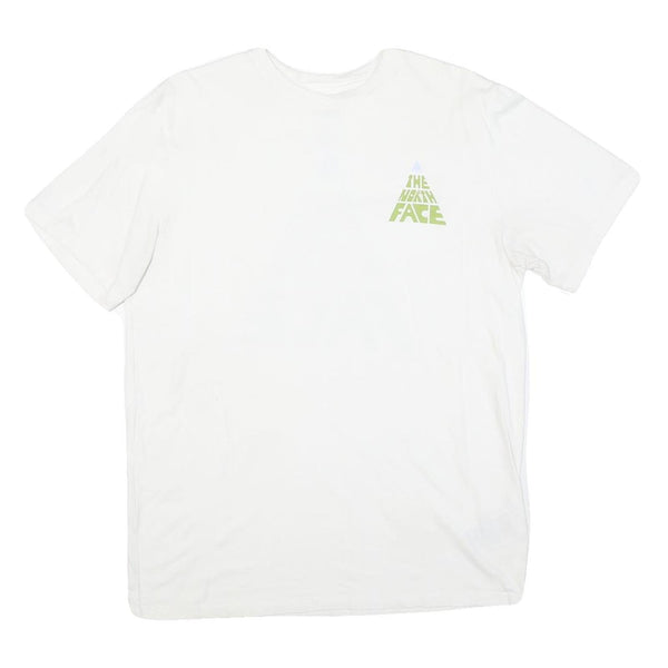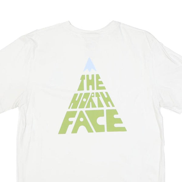 This mens T-shirt from The North Face is predominantly white with a distinctive green graphic logo printed on both the front chest and the back, featuring the brand's name stylised in a triangle shape with a small blue mountain peak detail above. The classic crew neck and short sleeves offer a simple, versatile look.