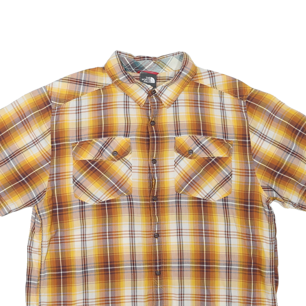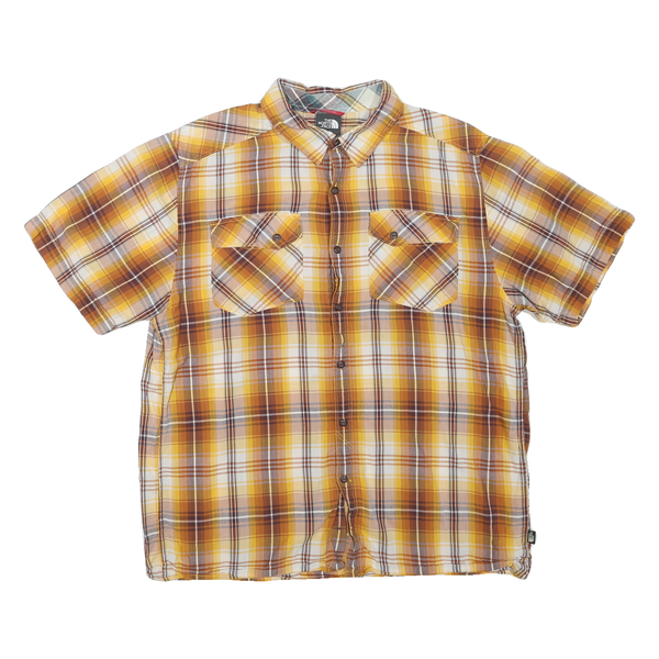 This Mens shirt from THE NORTH FACE features a yellow and brown checked pattern, combining shades of mustard, amber, and light brown with white accents for a classic outdoor look. It has a button-up front, short sleeves, and two chest pockets with button flaps for practical styling. The fabric feels soft yet durable, consisting of a comfortable cotton blend perfect for everyday wear.