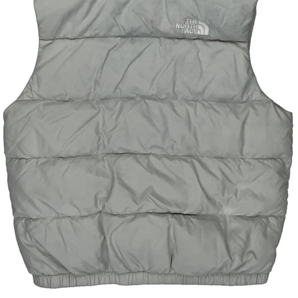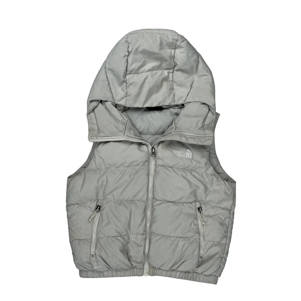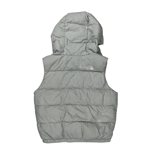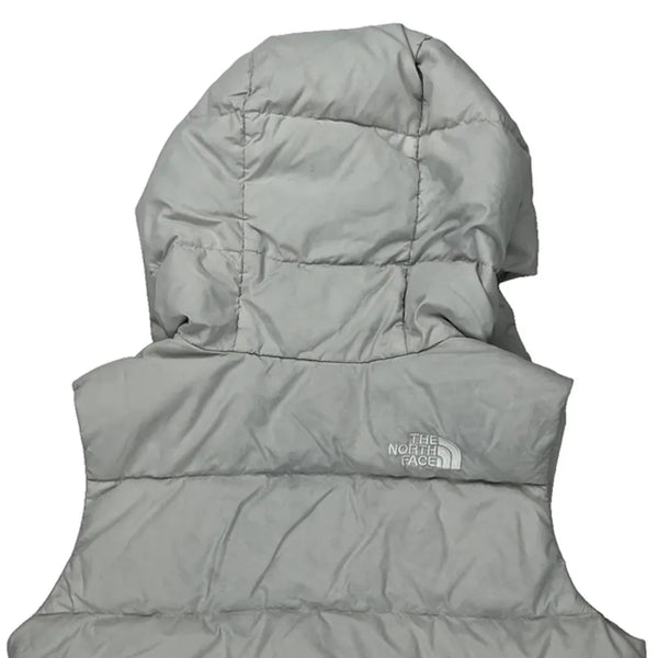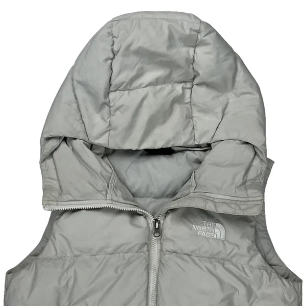 The North Face Women'S Grey Puffer Vest With Hood And Zipper Closure.