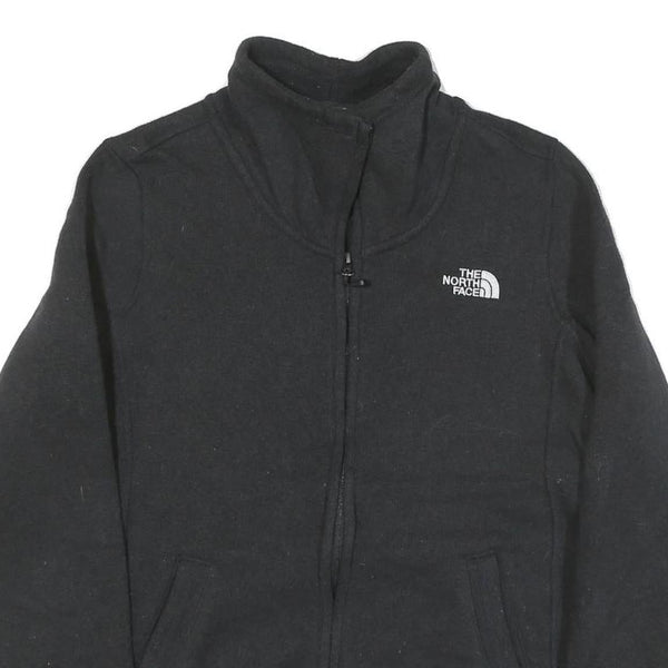 This womens black jacket from The North Face features a clean, classic design with the brand's iconic white logo embroidered on the left chest. The jacket has a high neck collar and a full front zip closure, providing warmth and versatility for outdoor wear. Two front pockets are seamlessly integrated into the design for practicality and style.